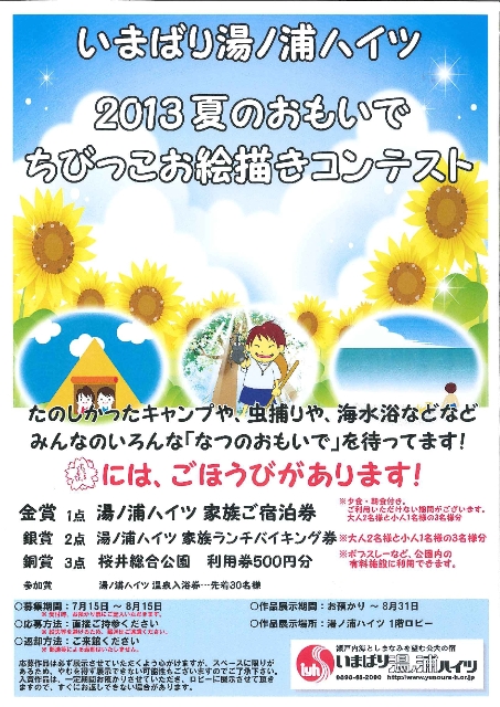 これは今治市にある公共の宿の「いまばり湯ノ浦ハイツ」で開催されており、お子さんが描いた「夏の思い出」を題材にした絵を募集しています。
